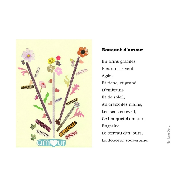 Et dans les cartes ? L’amour, au fond, est dans toutes puisqu’il s’agit d’envoyer une pensée agréable à quelqu’un. Mais certaines en parlent plus spécifiquement. Avec ta viole, hey ! est une déclaration-invitation. Incendiaire est plus passionnée-énervée. Sept rimes roses est un souhait virtuose / en sept pétales tendres / la joie en apothéose / un bonheur à prendre comme Bouquet d’amour.